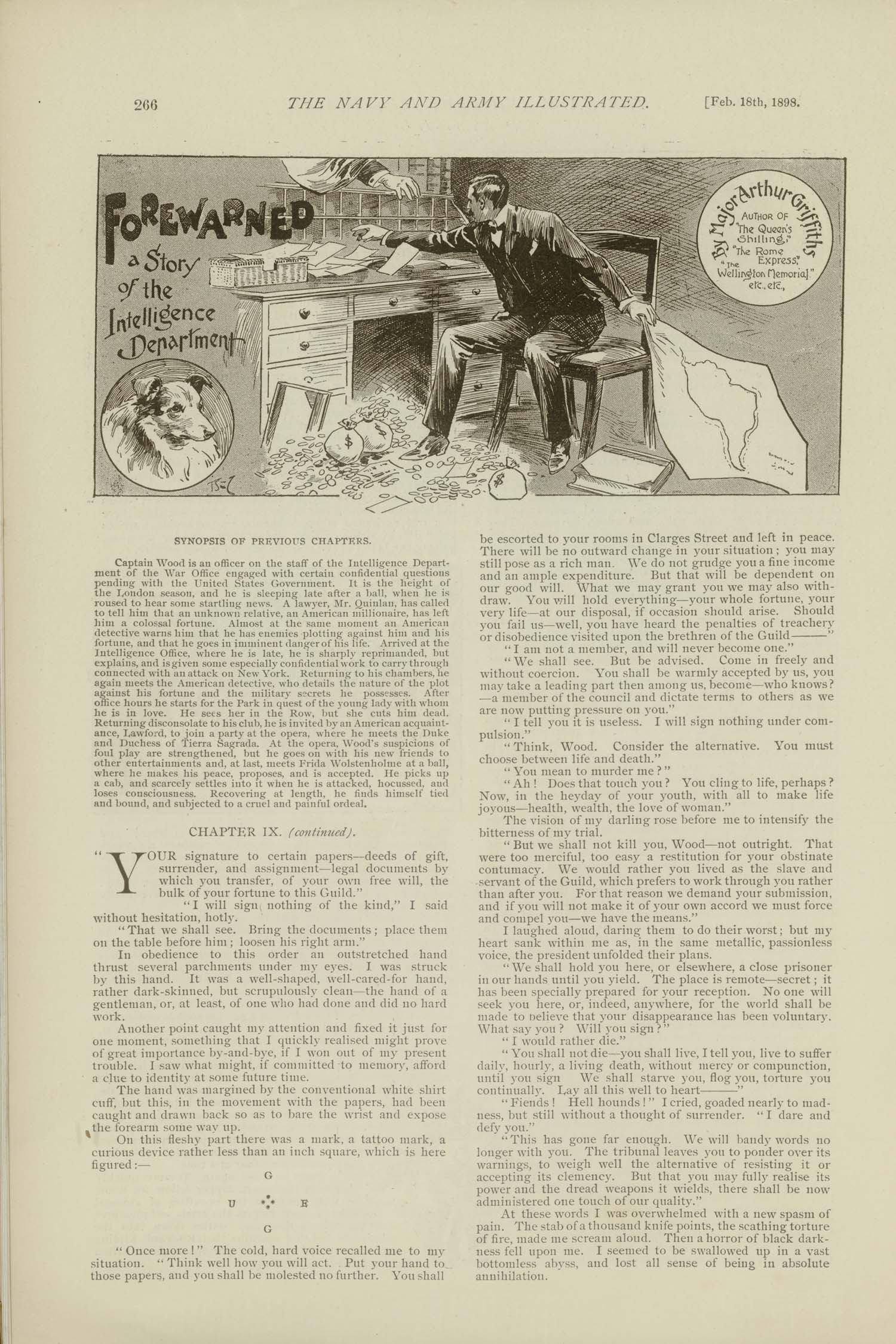 To show how the publishing industry worked – and that parts of a journal need to “fit” with the rest in some way – I decided to create a photo-shopped illustrated title based on that of the short story “Forewarned” by Major Arthur Griffiths in No.57 of The Navy and Army Illustrated (18th of February 1898), page 19.