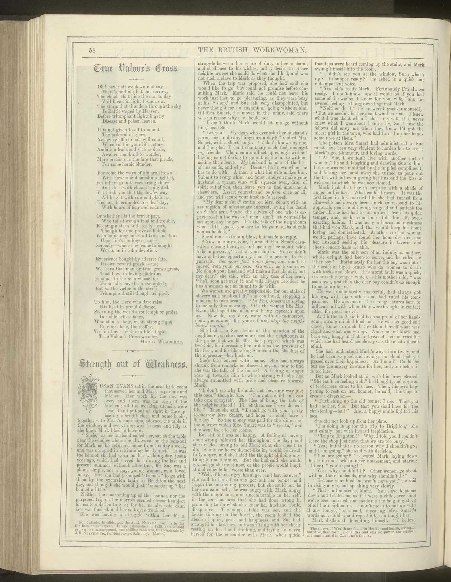 Published in number 272 of the penny weekly British Workwoman (dated May 1886), ‘Strength Out of Weakness’ is a short story about an episode in the life of a married couple, Susan and Mark Evans, in which there is the seeding of confrontation, then an argument, followed by an eventful aftermath. At its core, it can be read as a lesson, or at least, as an example that could serve as teaching, in surprising ways.