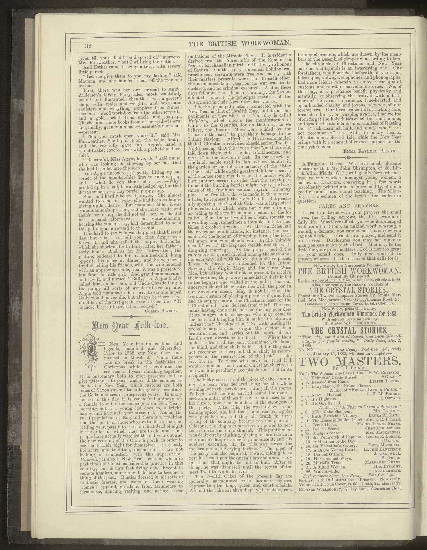 ment of a New Year, which customs are both ing the bean was declared king for the whole ,, 4. DaisyMarch, the Prison Flower.relics of Saxon superstitions designed to propitiate veniug,withthe privilege of ruling all the sports. Authorof “FEMALE LIFE IN PRISON.”the Gods, and secure prosperous years. In many To begin with, he Avas carried round the room a ,, 5. Aaron’s Harvest C. H. M. BRIDGE.